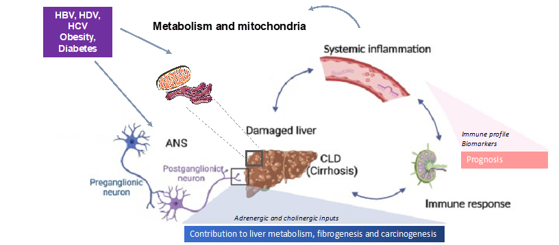 We will investigate the role of metabolic, inflammatory and intrahepatic neural pathways in chronic liver diseases at different stages and aim to identify and/or characterize pathways that could serve as prognostic biomarkers or as novel therapeutic targets, through three specific aims :